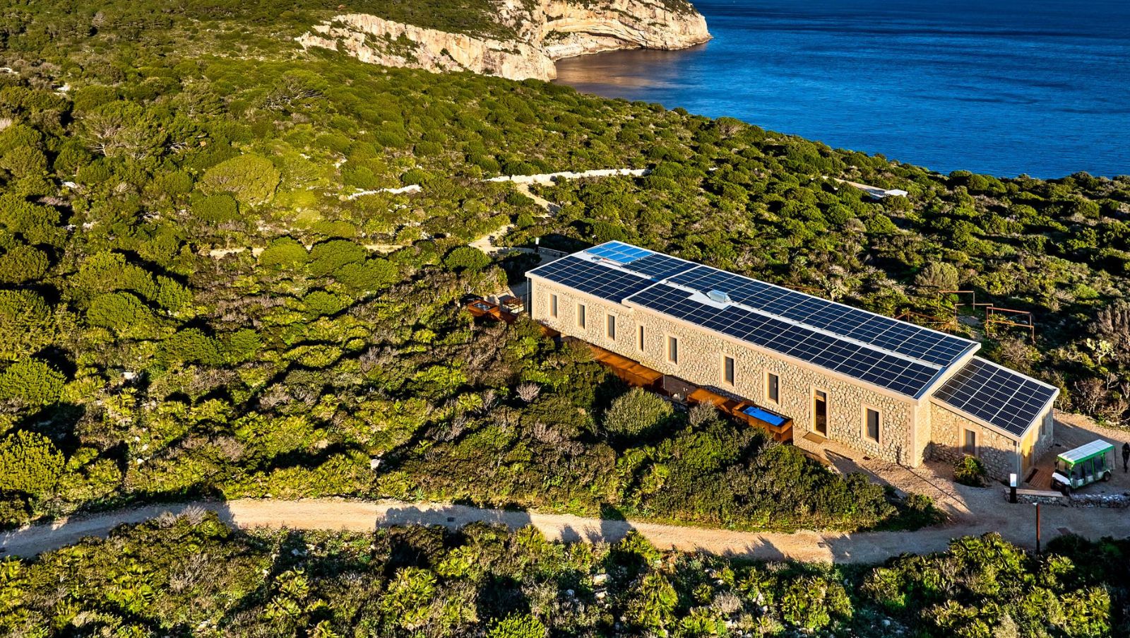edificio con pannelli solari sul tetto immerso in bosco vicino al mare